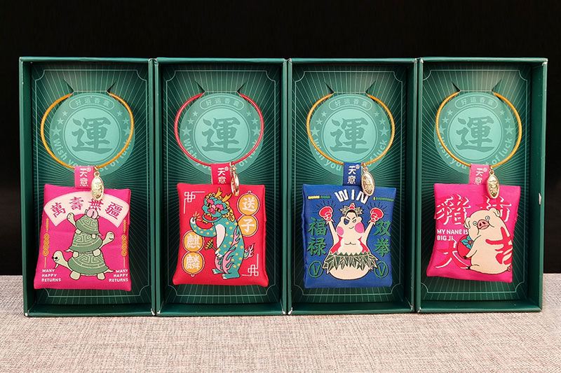 天意香囊采用原創(chuàng)國(guó)潮圖案,極富創(chuàng)意和趣味性,利用諧音梗配上搞笑圖片,比如“才華橫億”“福祿雙拳”等等符合年輕人的審美。